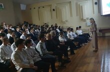 В гимназии прошла торжественная линейка, посвящённая выдаче атрибутики «Орлята России» - мешки для обуви, значки «Орлята России» и значки «Барсы» - символ республики.