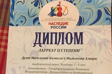 И вновь порадовали своими успехами сестры Мамлеевы Камиля и Амира. На Всероссийском фестивале-конкурсе детского, юношеского и взрослого творчества «Наследие России» Дуэт Мамлеевых завоевал звание Лауреата II степени. В сольном исполнении Мамлеева Амира – Лауреат II степени, Мамлеева Камиля – Лауреат III степени.Поздравляем преподавателя, Заслуженного работника культуры РТ Толмачеву З.Р. и концертмейстера Футину Н.В. и желаем дальнейших творческих успехов! -