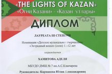 Диплом участника: Алеева Дана (ДМШ№13), Солтанова Рената (ДМШ№16 им.О.Л.Лундстрема, Калимуллина Рузия (ДМШ№6 им.Э.З.Бакирова), Ковшикова Виктория (ДМШ№4), Абрамова Анастасия (ДМШ №3 им.Р.Яхина), Сухомлинова Диана (ДМШ №13), Абдуллина Карина (ДМШ №13)