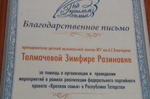 Руководитель конкурса «Нечкебил», председатель РОО РТ «Под крылом семьи», координатор федерального партийного проекта «Крепкая семья» в РТ, Член Общественной палаты РТ Изольда Павловна Жуйкова вручила Благодарственные письма всем участникам проекта.