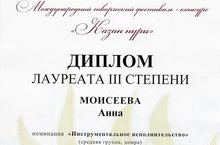 Учащаяся детской музыкальной школы №7 им.А.С.Ключарева Анна Моисеева (преподаватель А.Ю.Кильдюшкина, концертмейстер Л.В.Ефремова) стала Лауреатом III степени Международного конкурса «Казан нуры». Кильдюшкина А.Ю. в ансамбле с Г.Мухаметдиновой - Лаурет I степени. В числе компетентного жюри - Р.Абязов, Л.Лабзина, Д.Чефанов., Е.Кубышкин.