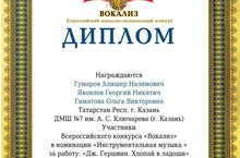 Учащиеся Детской музыкальной школы №7 им.А.С.Ключарева по классу домры Дарья Ли и Анна Моисеева с успехом выступили 14 мая 2016 года на I Международном конкурсе музыкально-инструментального исполнительства «KAZAN – MUSIC ЙОРТ». Конкурс проходил в Казанском государственном институте культуры. В состав жюри конкурса вошли Ректор Института культуры мира (ЮНЕСКО), президент Международной Гуманитарной Академии «Европа-Азия», член президиума Российской Ассоциации содействия ООН, академик, доктор исторических наук, профессор Э.Р.Тагиров, заслуженный работник культуры РТ Л.Н.Сазонкина, заслуженный работник культуры РТ, доцент кафедры музыкального исполнительства КазГИК Ю.Г.Королев, лауреат всероссийских и международных конкурсов А.Ф.Давлетшин. Дарья Ли (преп.Гарапшина Э.Ф., концертмейстер Ефремова Л.В.) удостоена звания ЛАУРЕАТА I степени.