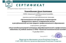 2023 елның 15 декабрендә Таҗетдинова Алия Азатовна" Республика Урта һөнәри белем бирү системасында "заманча мәктәп" федераль проектын оештыру-методик озата бару " Республика семинарында катнашты һәм "Казан политехник көллияте "ДАПОУДА гомуми белем бирү һәм һөнәри әзерлекне дисциплинаара интеграцияләү тәҗрибәсе"темасына доклад белән чыгыш ясады