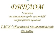 Команда нашего колледжа награждена дипломом I степени в турнире по шахматам среди ССУЗов Республики Татарстан.