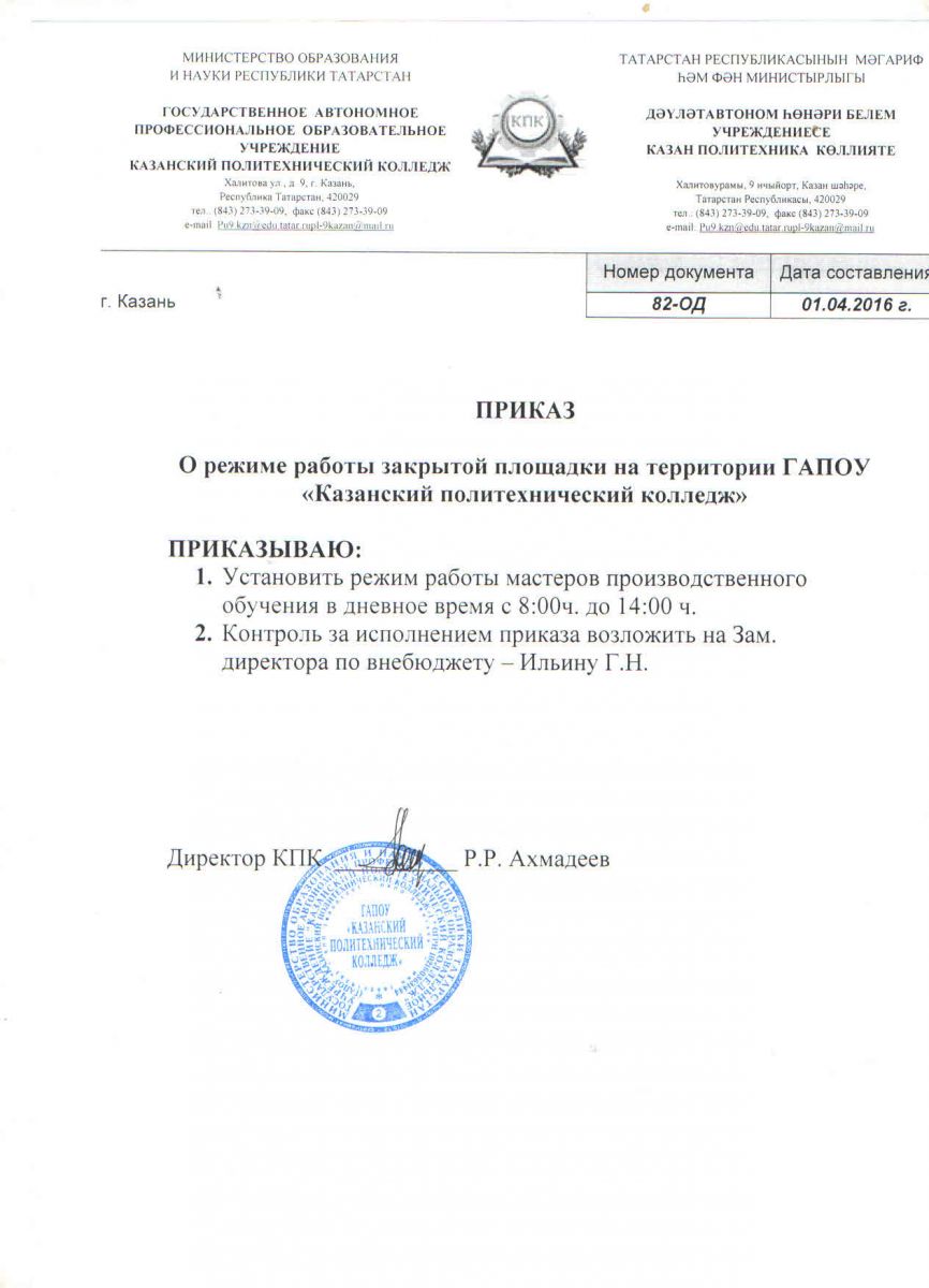 Приказ О режиме работы закрытой Площадки на территории ГАПОУ Казанский политехнический колледж