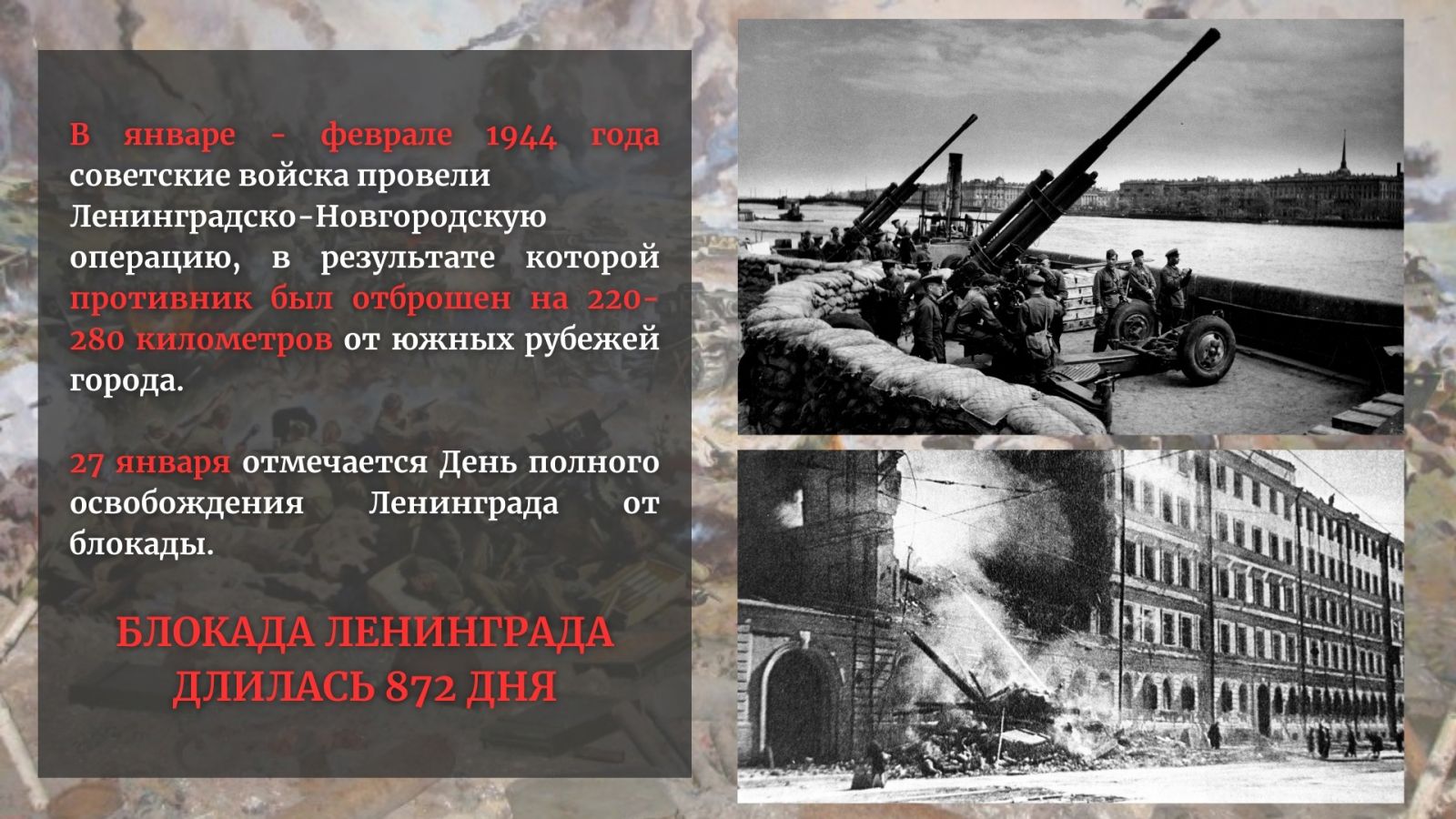 Одновременное наступление по всем фронтам дало положительные результаты. 27 января в Ленинграде впервые за время блокады прогремел праздничный салют, ознаменовавший День снятия блокады Ленинграда!