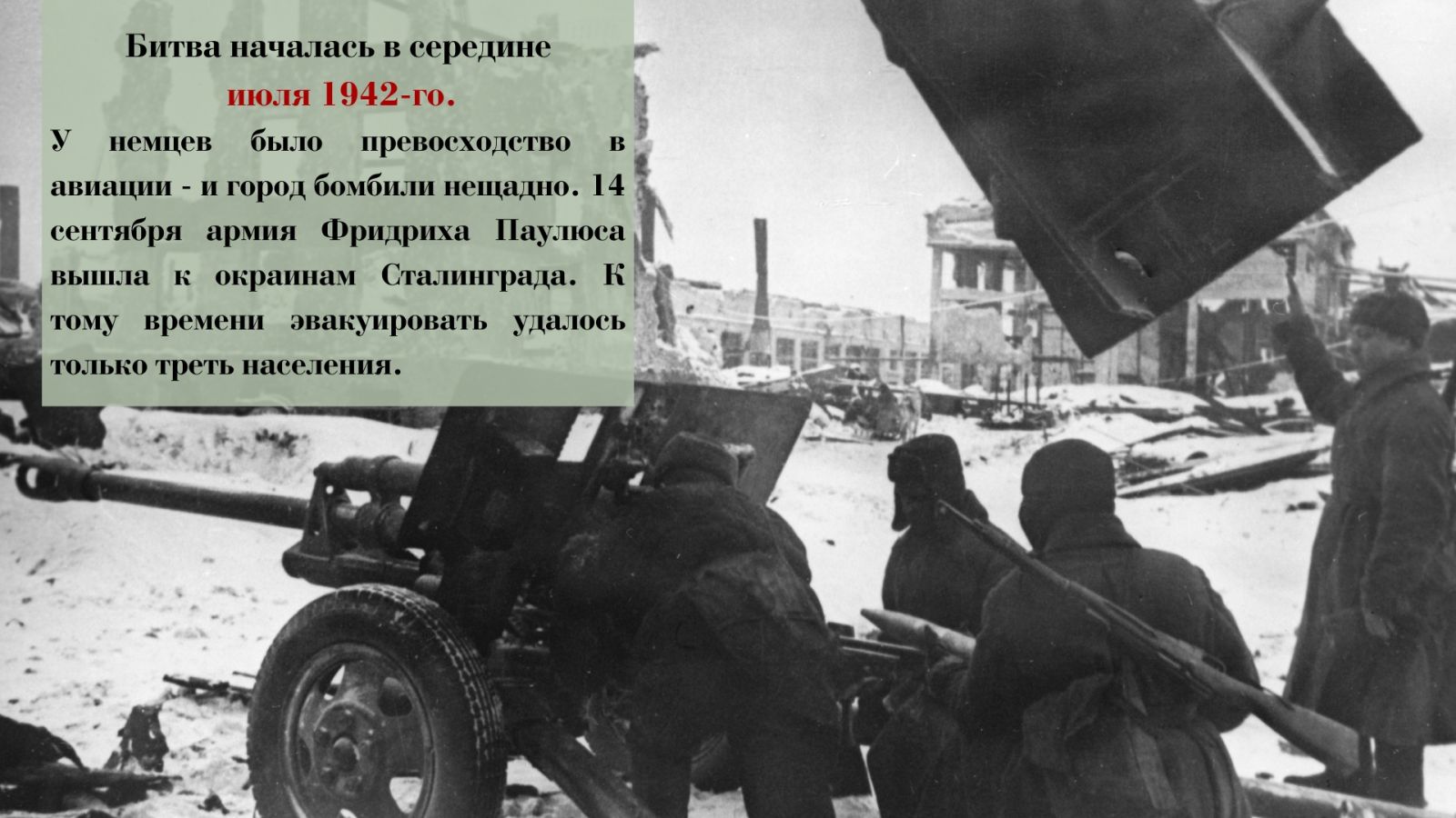 Сталинградская битва (1942-1943гг) началась на правобережье Дона, в ней участвовало более 2 млн человек, а погибло более миллиона. Она была отмечена самыми кровавыми уличными боями в разрушенном Сталинграде и невероятным героизмом советских солдат трех фронтов, который потряс немцев, уничтожил группу армий «В» и подорвал их боевой дух. С этой битвы начался перелом в Великой Отечественной войне.