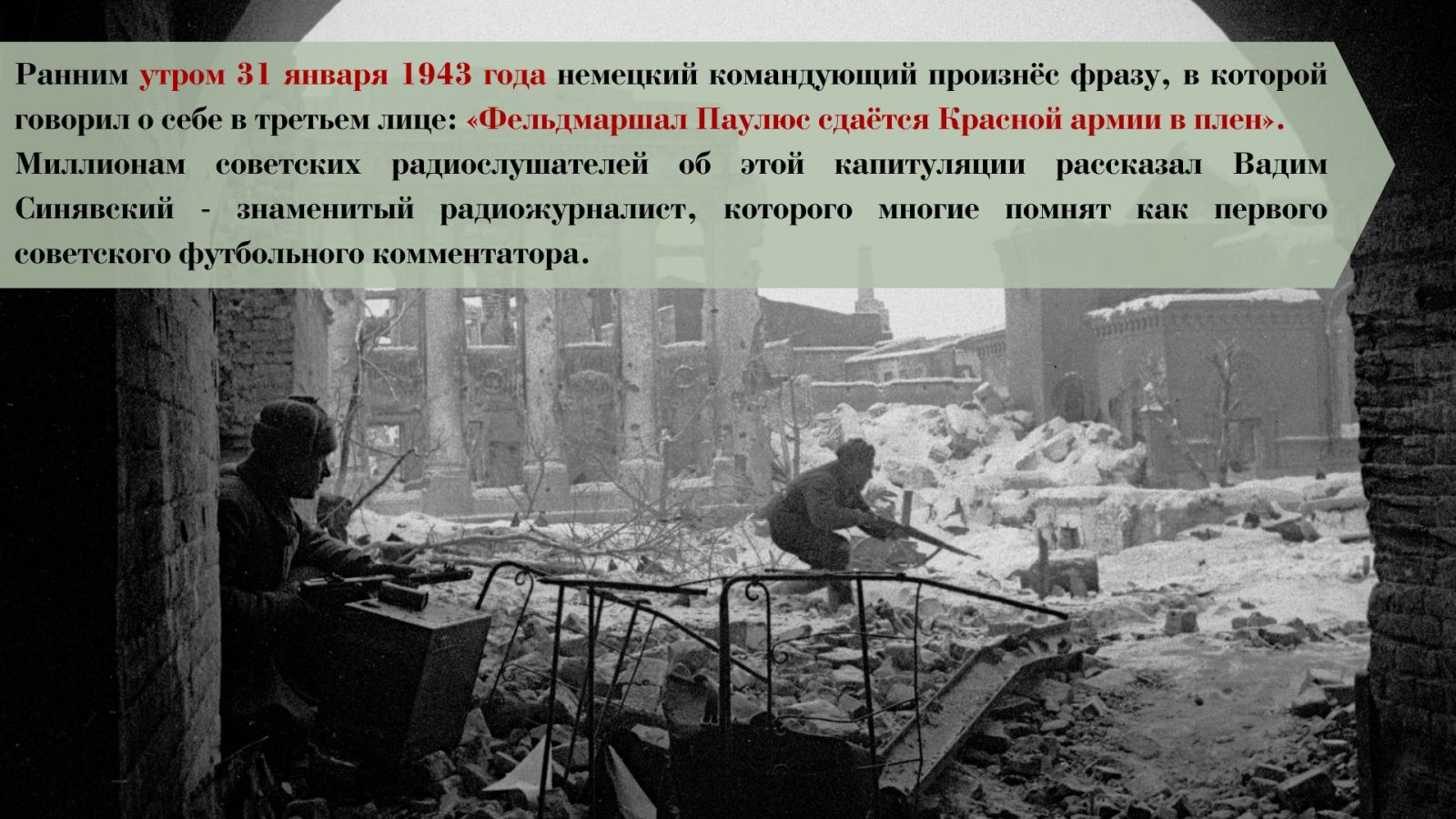 «Эх, Сталинград, Сталинград... Как часто о нём вспоминаешь! Об этом городе, стёртом на твоих глазах с лица земли и всё-таки оставшемся живым...» – восклицал писатель Виктор Некрасов – заместитель командира сапёрного батальона, защищавший Мамаев курган на протяжении всех «дней и ночей» великой битвы.