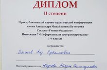 Поздравляем нашего лицеиста, ученика 3Б класса, Валиева Аяза и его учителя Юсупову А.Х., получивших диплом 2 степени на II Республиканской научно-практической конференции им.А.М.Бутлерова на секции "Ученые будущего" (подсекция "Информатика и программирование" 1-4 классы).