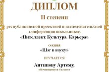 Поздравляем ученика 4А класса, получившего Диплом 2 степени на Республиканской проектной и исследовательской конференции школьников "Интеллект. Культура. Карьера" в секции "Шаг в науку". Научный руководитель: Ясавеева Д.М.