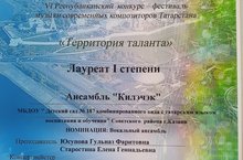 7 февраля 2021 года на базе МБУДО "Детская музыкальная школа №24" Кировского района г. Казани прошел VI Республиканский конкурс - фестиваль музыки современных композиторов Татарстана "Территория таланта". Ансамбль нашего детского сада "Килэчэк" стал лауреатом I степени в номинации: "Вокальный ансамбль". Поздравляем всех участников и их руководителей - Юсупову Г.Ф. и Старостину Е.Г.!