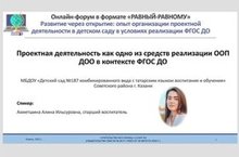 11 февраля 2021 года старший воспитатель нашего детского сада - Ахметшина А.И., приняла участие в качестве спикера в онлайн-форуме "Развитие через открытие: организация проектной деятельности в детском саду в условиях реализации ФГОС ДО", тема выступления: "Проектная деятельность как одно из средств реализации ООП в контексте ФГОС ДО". Данный форум проведен в рамках работы Международного педагогического сообщества "Учительство без границ".