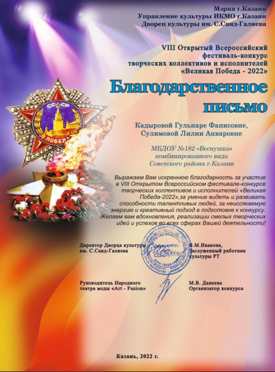 А ТАКЖЕ ПОЗДРАВЛЯЕМ ПОПОВУ Э.Р. И СУЛИМОВУ Л.А. С ПОЛУЧЕНИЕМ ПОЧЕТНОЙ ГРАМОТЫ ОТДЕЛА ОБРАЗОВАНИЯ ПО СОВЕТСКОМУ РАЙОНУ.УПРАВЛЕНИЯ ОБРАЗОВАНИЯ ИСПОЛНИТЕЛЬНОГО КОМИТЕТА Г. КАЗАНИ.