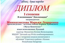 Поздравляем воспитанницу группы №14 с победой в конкурсе "Язык - душа народа". Миннахметова Марьям Ленаровна заслуженно получила диплом первой степени, прочитав наизусть детскую сказку Корнея Чуковского "Муха-Цокотуха"