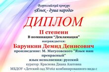 В конкурсе "Язык - душа народа" Барункин Демид Денисович занял 2 почетное место, Диярова Айлин - 1. Поздравляем