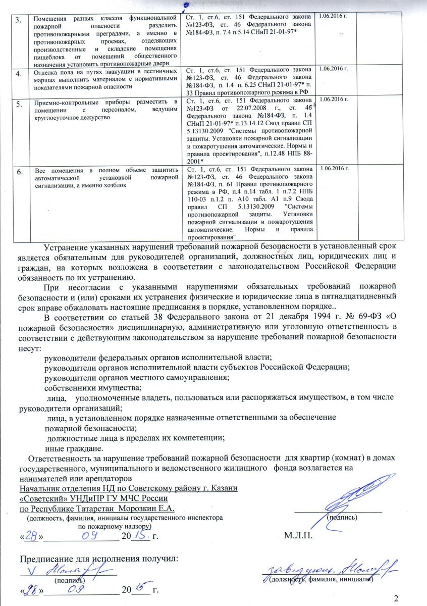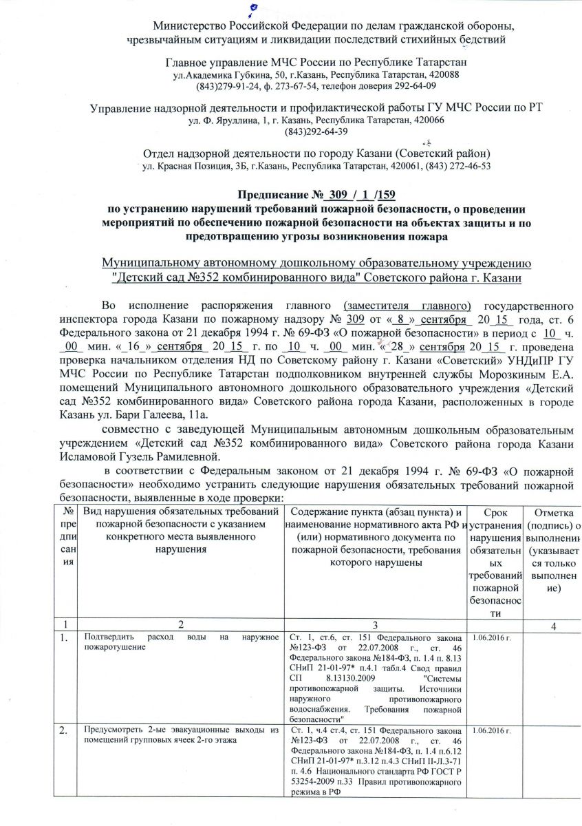 Ответ на предписание №207/1/121 по устранению нарушений требований пожарной безопасности, о проведении мероприятий по обеспечению пожарной безопасности на объектах защиты и по предотвращению угрозы пожара от 05.07.2019