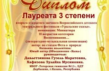 Поздравляем юных актеров нашей гимназии, которые стали призерами 3 степени всероссийского литературно-театрального фестиваля "Уральские сказы" учащихся 2 Б класса Давлетзянова Абдуллу и Медведеву Наргизу