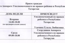 Запись на прием к Уполномоченному по правам ребенка в РТ осуществляется по телефону : (843) 236-61-64.
