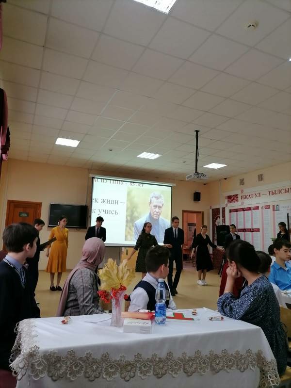 19.10.2021 в нашей гимназии было проведено мероприятие в рамках проекта "Литературные дворики", посвященное к 85-летию со дня рождения В. Распутина. В постановке участвовали учащиеся 7-10классов. В литературном кафе "Рябинушка" ребята говорили о творчестве автора знаменитой книги-"Уроки французского". В уютной и теплой атмосфере литературы ребята продемонстрировали свои знания крылатых выражениий его книг, с энтузиазмом инсценировали отрывки произведений писателя, посмотрели видеоролик о жизни и творчестве великого писателя. Много интересного узнали ребята о жизни и творчестве В.Распутина