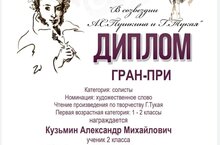 2Б сыйныф укучысы Кузьмин Александр күп кенә иҗади конкурсларда җиңүче булып тора. Бөек татар шагыйре Г. Тукайның туган көне алдыннан ул төрле конкурсларда катнашты. "В созвездии А.С.Пушкина и Г.Тукая" Республика иҗади конкурсында Гран-прига лаек булды .