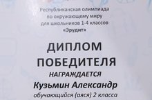 В Республиканской олимпиаде по окружающему миру для школьников 1-6 классов "Эрудит" Кузьмин Александр набрав 48 баллов из 56 стал победителем. Поздравляем! Котлыйбыз!