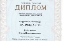 Поздравляем призеров заключительного этапа республиканской олимпиады школьников по русскому языку Шарафутдинова Данияра (6 класс), по русской литературе среди учащихся с обучением на родном (нерусском) языке Габдулхаеву Элину (9класс).