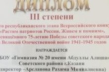 Наша гимназия приняла участие в республиканском этапе Всероссийского конкурса " Растим патриотов России. Живем и помним", посвященного 75-летию Победы советского народа в Великой Отечественной войне 1941-1945годов"и была удостоена Диплома III cтепени.