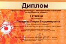 Лебедева Лидия Владимировна, учитель русского языка и литературы, приняла участие в I Всероссийском конкурсе педагогических разработок « Современный педагог» и была удостоена