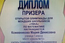 Поздравляем Кожевникову Марию Денисовну, ученицу 1 класса, и Филиппова Антона Александровича, ученика 1 класса, с дипломом призера открытой олимпиады для младших школьников «Умка» по математике (учитель Семенова Светлана Владимировна). Желаем нашим ученикам дальнейших побед!