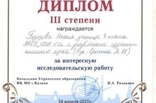 Поздравляем Газизову Санию (8 класс, руководитель - Ерохина Я.И.) с дипломом III степени за интересную исследовательскую работу на VI Научно-исследовательской конференции г.Казани "Язык. Культура. XXI век".