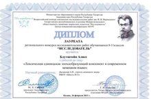 Гришину Алису (Диплом I степени, Подсекция 10 "Год родных языков и народного единства Республики Татарстан", 5-8 классы, научный руководитель - Бикмаев А.И.);