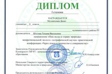 День за днем - новые победы и свершения! Муллагиев Дениз (8 класс, руководитель - Шустова Т.В.) заслужил диплом I степени на межрегиональной эколого-географической научно-практической конференции "Через поиск и творчество к совершенству", направление "Наш вклад в охрану природы". Поздравляем!