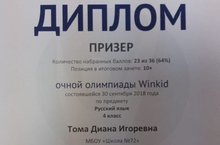 Поздравляем Тома Диану, ученицу 4 класса, получившую диплом призёра на очной олимпиаде WINKID по русскому языку. Научный руководитель – Семёнова С.В. Желаем новых творческих побед!