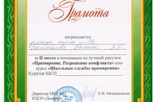 Поздравляем Самойлову Полину, ученицу 8 б класса, которая заняла 2 место в номинации за лучший рисунок «Примирение. Разрешение конфликта» конкурса «Школьные службы примирения». Желаем новых творческих побед!