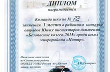 Поздравляем наш отряд Юных инспекторов дорожного движения , который занял 1 место в районном конкурсе «Безопасное колесо – 2015» среди школ микрорайона «Центр». Поздравляем ребят и желаем дальнейших побед!