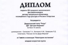 Поздравляем учащихся 1Б, 1В и 2Г классов, занявших 1 место в VIII городском экологическом фестивале-конкурсе детских театральных коллективов, посвященного Году культуры в России и Татарстане. Руководители: Белоенко Н.М., Саляхова Г.А., Литвиненко Н.В., Ярцева С.Г., Храмцова Л.Д.