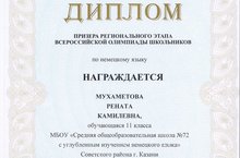 Мухаметова Рената - призёр регионального этапа всероссийской олимпиады школьников по немецкому языку. 06.02.2015