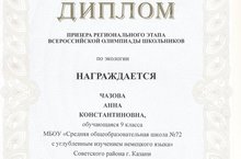 Чазова Анна - призёр регионального этапа всероссийской олимпиады школьников по экологии. 13.02.2015