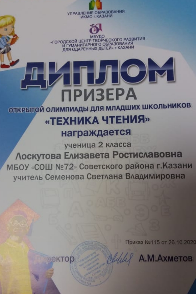 Лоскутовой Елизаветой (номинация "Техника чтения");