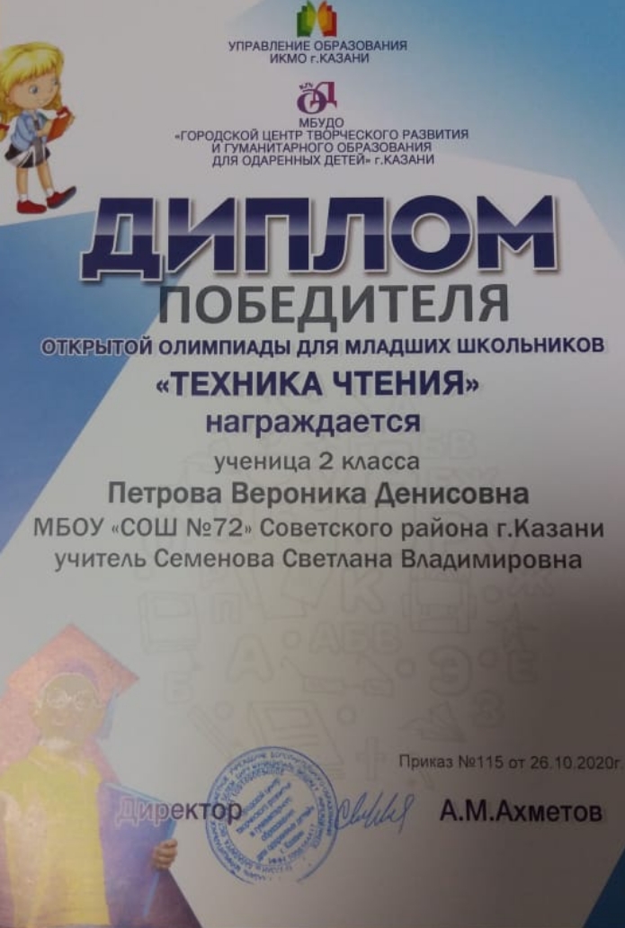 Петровой Вероникой (номинация - "Техника чтения");