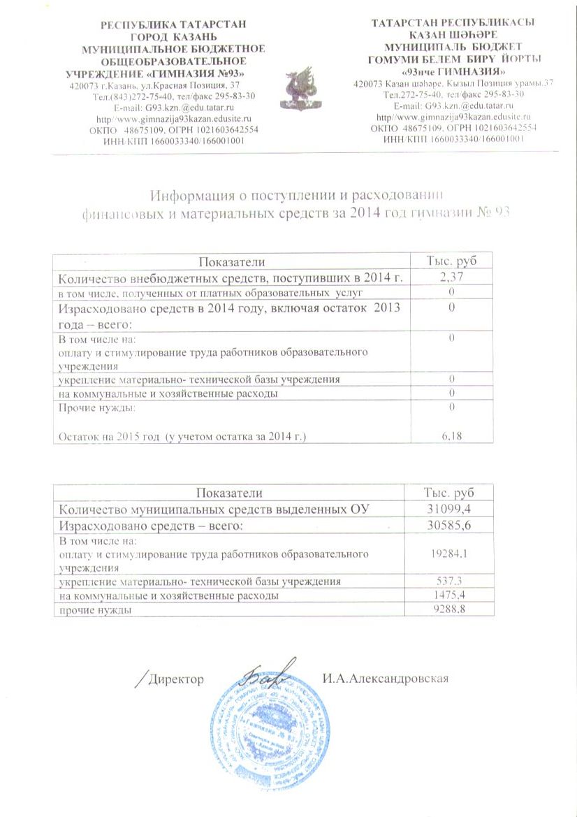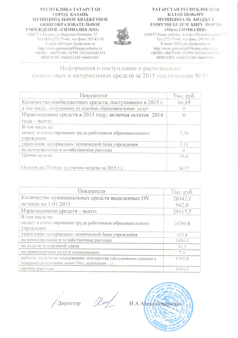 -Информация о поступлении и расходовании финансовых и материальных средств за 2015 год гимназии №93 1 стр