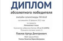 Поздравляем победителей и призёров онлайн-олимпиады Winkid, состоявшейся 20 февраля 2022 года: абсолютного победителя по математике Павлова Артура (4 а класс),победителя Сабирова Альмира (4а класс)по русскому языку, призёра Майорову Юлию (4а класс) по окружающему миру,победителя Касимову Полину (4а класс) по русскому языку, победителя Галимзянову Самиру (4а класс) по русскому языку. Поздравляем и благодарим учителя начальных классов Ненастину Ларису Дмитриевну за подготовку обучающихся!