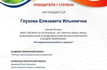 Глухова Екатерина, ученица 7в класса (руководитель работы Баранова Р.Г.), стала победителем в первом всерроссийском конкурсе "Исследовательские работы и проекты" с конкурсной работой "История происхождения русских фамилий". Молодец!Так держать! Впереди ждут новые победы!