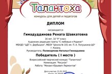 Поздравляем Гимадуддинову Ренату, ученицу 10у класса с победой во Всероссийском творческом конкурсе "Талантоха", в номинации "Рисунок" по произведениям Михаила Юрьевича Лермонтова- портрет Лермонтова М.Ю. Так держать!