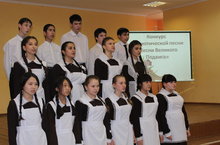 Сегодня в школе прошёл конкурс патриотической песни «Песни Великой Победы» среди учащихся 5-9 классов. Звучало много новых, «неизбитых» песен: «Гимн МЧС», «Катюша», «Ветераны», «У кремлёвской стены», «Смуглянка», «Давным-давно была война», «Аты-баты», «Россия-Родина!». Ребята исполняли песни очень хорошо и поэтому жюри щедро ставили баллы. Результаты конкурса: 1 место- 5к,6б,8а,9а,9б классы;