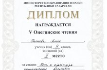Поздравляем Галиеву Алию, ученицу 9б класса и учителей русского языка и литературы Поликарпову Наталью Геннадьевну, Хузиахметову Лилию Наильевну занявших 2 место на республиканской НПК "Онегинские чтения".
