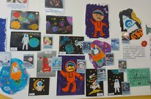 Яркие рисунки и проекты учеников украсили стенд Школы №108. Выставка рисунков ко дню космонатики.