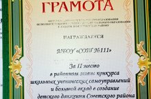 Наша школа заняла второе место в районном этапе конкурса школьных ученических самоуправлений и удостоена грамотой за большой вклад в создание детского движения Советского района.