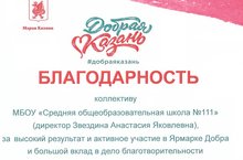 Коллективу МБОУ "Школа №111" объявлена благодарность за высокий результат и активное участие в Ярмарке Добра и большой вклад в дело благотворительности.
