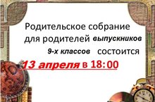 Приглашаем Вас на родительское собрание, которое состоится 13 апреля в 18 часов. Тема родительского собрания: "Итоговая аттестация 9-х классов в 2016 г."